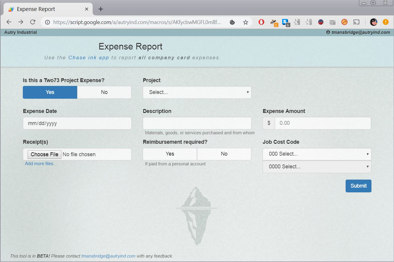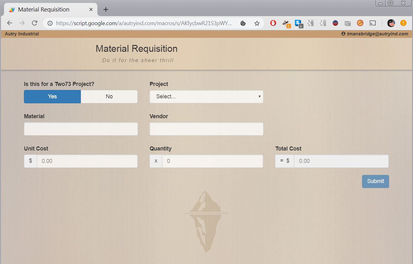 I've developed a variety of fully-responsive web sites and applications for Autry and Two73 along with a handful of personal project web sites and tools. In addition to two public-facing company profiles for Two73, a suite of internal tools for managing various aspects of the business were under development in preparation for rapid expansion of our product if necessary. These applications were largely created using HTML, CSS, and Google Apps Script, a variant of JavaScript with tie-ins to our Google Suite ecosystem, offering seamless login, user and data management.