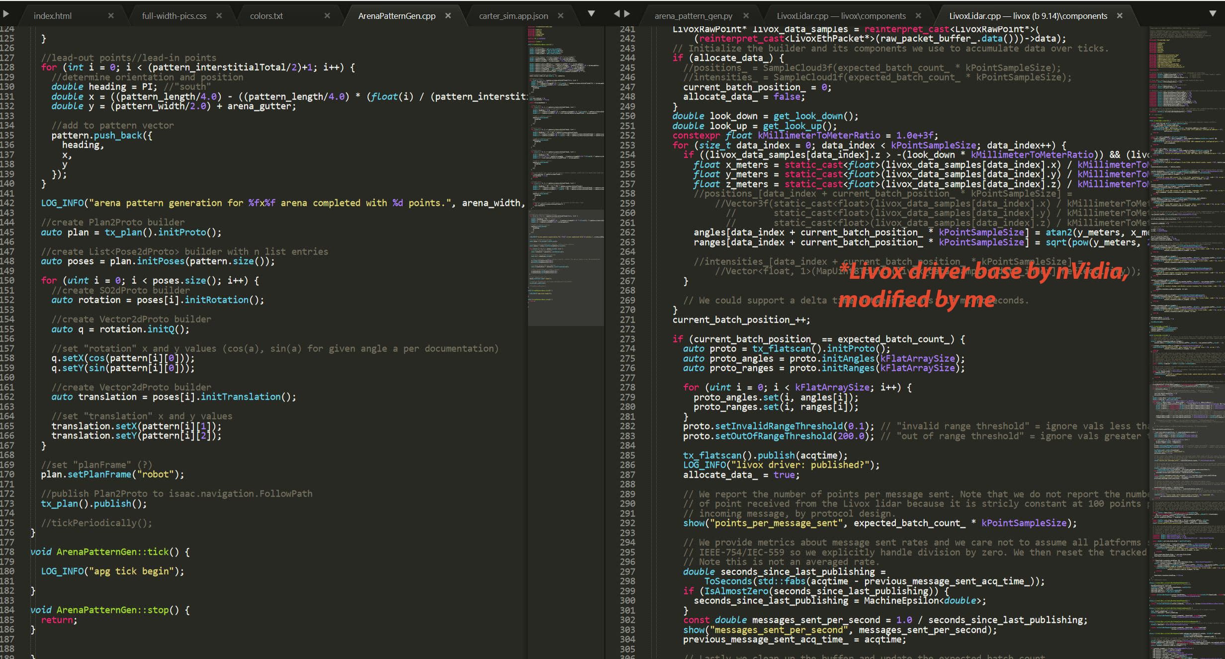 Our fully-electric semi-autonomous agriculture robot, Mason, was designed using nVidia's cutting-edge Xavier and Jetson hardware and the Isaac robotics ecosystem to deliver key insights to the user about their environment while performing automated tasks and providing hauling and other support in the field. On this project, I was the principal developer on manual controls, automated pathmaking and object avoidance, localization, signals processing (ultrasonic sensors, LiDAR, stereoscopic cameras) as well as interface and lights.